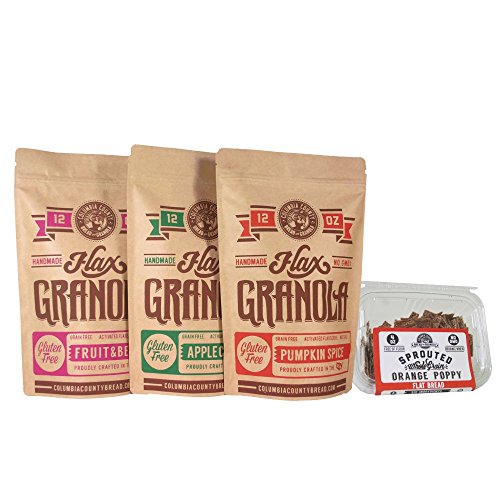 Lyn Genet has been recommending our unique flax-granola (she even helped us refine the recipe) for over three years. Now that Lyn has published "The Plan" we're offering a special, flat-rate package deal that includes: Two 12 oz bags of "Plan Friendly" Fruit & Berry Flax-Granola, One 12 oz bag of "Plan Friendly" Apple Cinnamon Flax- Granola and one 12 oz bag of "Plan Friendly" Pumpkin Spice Flax-Granola. These are unique, hand crafted products prepared with immense skill and dedication to quality. We prepare our crunchy-chewy flax-granola fresh daily by soaking dried, sweetened cranberries, mixing in ground cinnamon then adding flax seeds. Depending on the variety, we then add walnuts, sunflower seeds and other dried fruits. We bake in low heat for several hours, teasing the flax until it clusters naturally into granola-like nuggets. We add NO salt, NO wheat, NO oats, and NO additional sugars nor preservatives. This is a GMO free product handcrafted by the bakers of Columbia County Bread & Granola. *We make our products in a facility where products with gluten (wheat) are also prepared