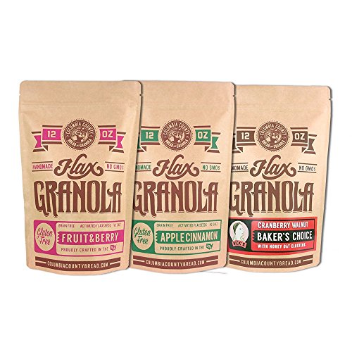 Don't be fooled by the other flax seed granola imitators. We prepare our crunchy-chewy flax-granola by soaking dried, sweetened cranberries, mixing in ground cinnamon then adding flax seeds. Depending on the variety, we then add walnuts, sunflower seeds and other dried fruits. We bake in low heat for several hours, teasing the flax until it clusters naturally into granola-like nuggets. We add NO wheat, and NO added preservatives. This is a GMO free product handcrafted by the bakers of Columbia County Bread & Granola. *We make our products in a facility where products with gluten (wheat) are also prepared